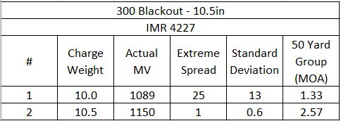 With 10.0gr of IMR-4227 the velocities were just a little higher than the target. However, the accuracy wasn’t what I was looking for and this load didn’t lock my bolt back on the last round. I found other loads that performed better durring my testing and wouldn’t use this.