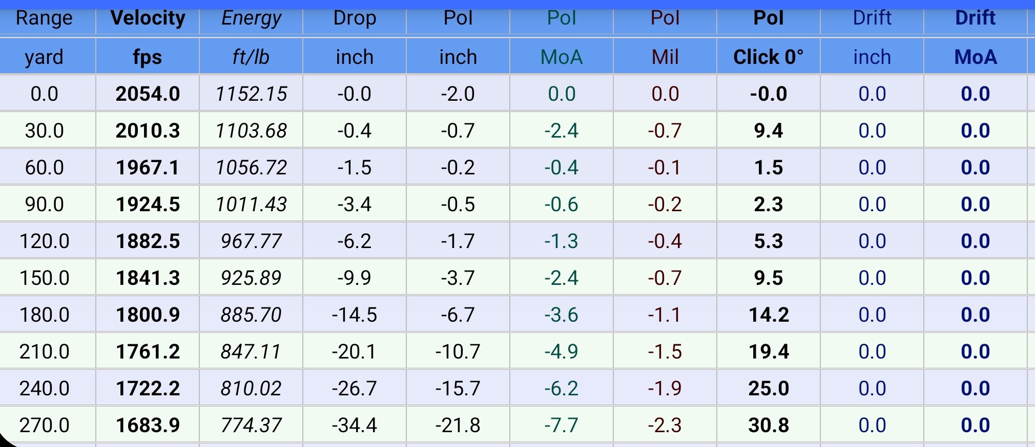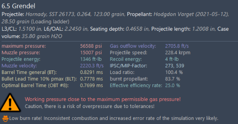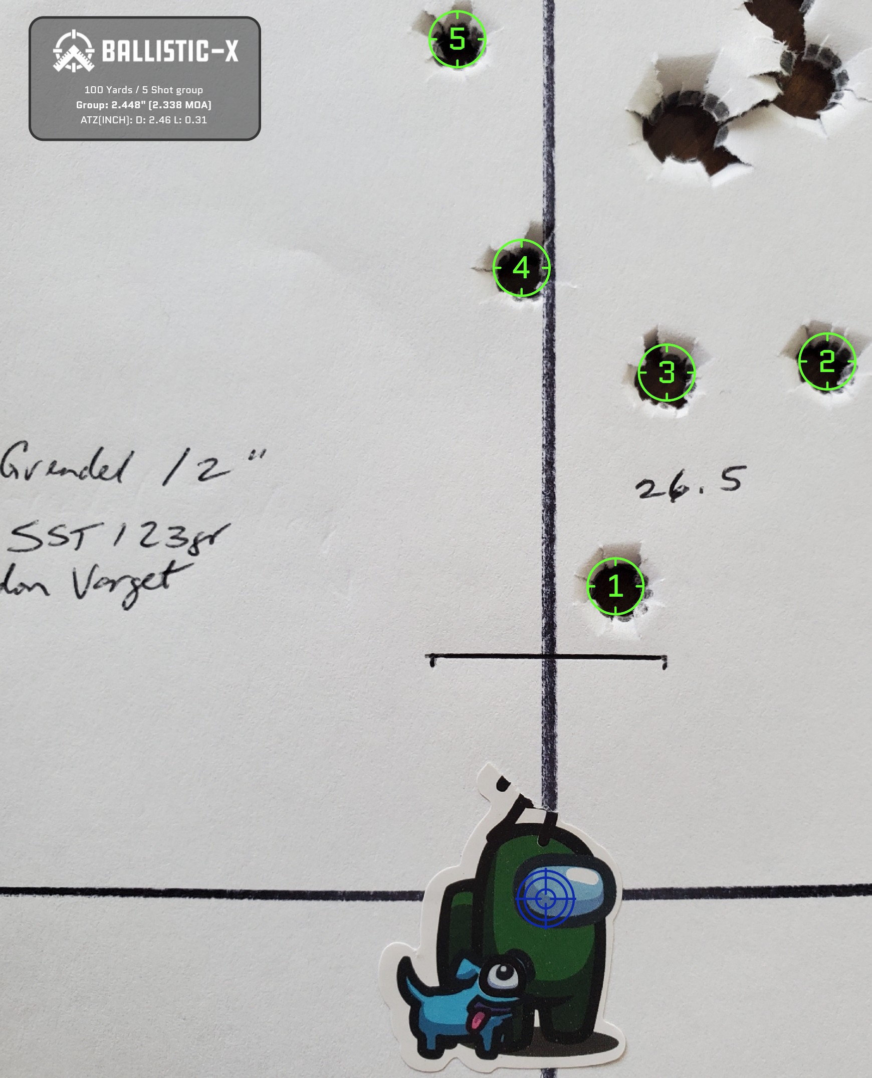 - Bullet: Hornady 123 gr SST – G1 B.C.: 0.510